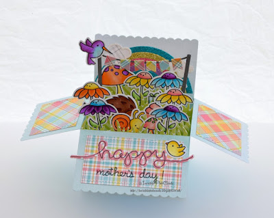 I realised I haven't posted this year's Mother's Day Card. I was excited to get to play with the new Lawn Fawn box card die, and I thought I'll make a garden party to celebrate spring. I had so much fun stamping and colouring the flowers and all the cute little critters. And I love how all the pieces from the box card die fit together. I've made box cards before but this die takes away all the fuss having to cut and measure the elements of the box.