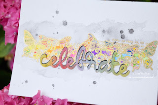 I started by stamping the gorgeous STAMPlorations Flutter Zen Row stamp onto watercolour paper and heat embossed the delicate butterflies in gold. Then I used my super fine watercolour brush and Gansai Tambi watercolours to colour the butterflies in all the colours of the rainbow. After colouring the butterflies, I added some grey around the butterflies for contrast, and splattered some black onto the background. Then I tackled the daunting task of watercolouring the tissue paper. Again, I couldn't help myself but colour it into a rainbow. I'm really on a rainbow streak! Then even more challenging, I dried the tissue paper using my heat gun, and scrunched it up. Then I glued it onto vellum, and die cut using the CUTplorations Celebrate Word die. I also cut a second sentiment in black to create some contrast.